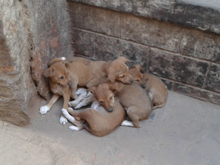 Ayer pude contemplar una imagen conmovedora que me inspiró para escribir sobre los perros de Varanasi. En una calle estrecha pasó un rickshaw cargado con mercancía y le dio a un cachorrito (de un mes más o menos) en una patita. El perrito se puso a llorar como loco, y en seguida llegó su mamá y se puso delante para que cogiera la teta. El perrito empezó a mamar entre sollozos…